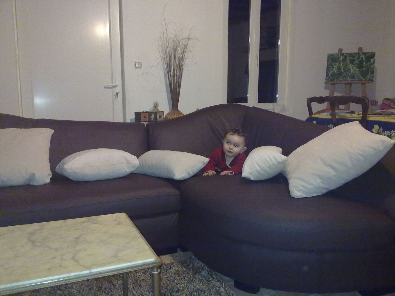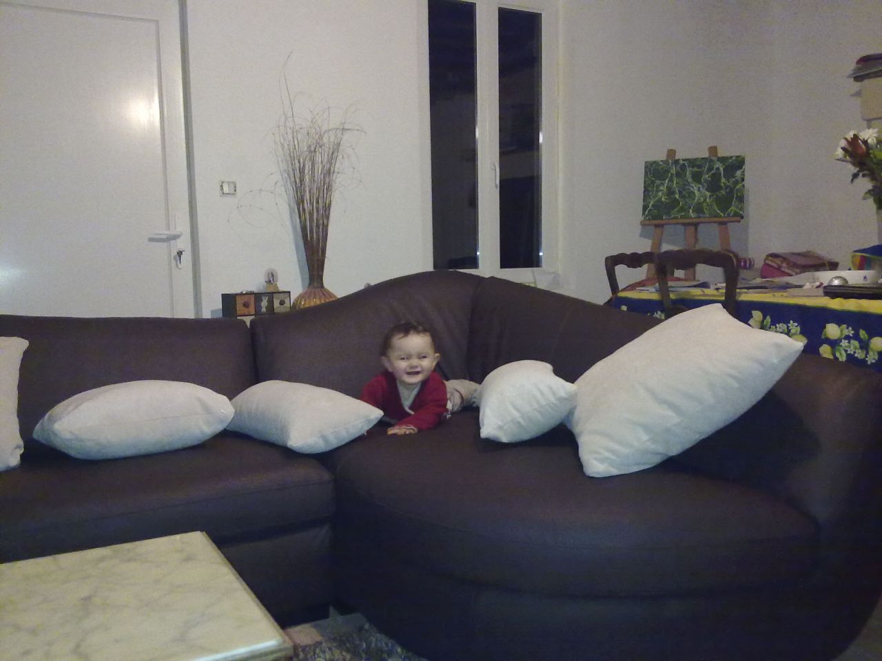 Dire merci | avec Lily en train de jouer dessus mais faut que je me penche sur la liaison entre mon tel et mon ordi, après manger si j'ai le courage sinon demain! et puis le mieux sera de venir l'essayer! c'est un angle en cuir chocolat avec coussins ecrus! |