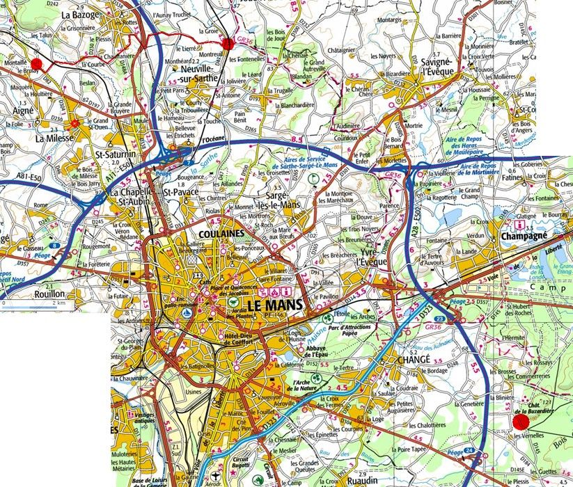 | Dire merci | Le trajet du samedi matin : L'idéal étant d'aller de chez juligi (le rond en bas à droite) jusqu'à l'autoroute (vers la sortie 23), soit 8-10km aller/retour ![]() Le trajet du samedi aprem’ : Le carré rouge au NE, c’est chez juligi ; Le carré rouge à l’Ouest, c’est Moncé-en-Belin Le carré rouge au milieu, c’est Téloché Le trajet est plus long qu’en passant par Ruaudin/Mulsannes, mais sûrement bcp plus agréable. >>> on fait demi-tour quand on veut, hein, on va pas jusqu'au bout ![]() |
