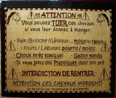 | Dire merci | " Un cheval c'est imprévisible, Veuillez ne pas rentré dans leurs pré " Ca c'est bien, mais tu sais des gens sont un peu idiots, et se disent " Mais je lui donne du pain derrière la cloture, je peux continuer" Moi je mettrai " Pour la santé de ces chevaux, ne pas les nourrir de pain, ..." enfin comme tu l'entends ! Moi j'ai de la chance, quand qlq1 est en train de les nourrir, je vais de suite les accoster pour les prévenir, rien de mieux ! |