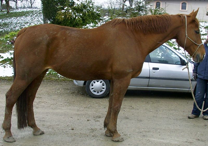 | Dire merci | Alors j'esaie désespéremment de charger les photos. Sincèrement, je m'attendais à pire. Elle a perdu son gros ventre, mais ça c'est bien par ce q'il était tout gonflé, et c'était pas de la graisse. Elle a perdu ses muscles de positions au niveau des épaules. L'encolure reste encore pas mal musclée ainsi que le poitrail (je précise que la jument était hyper musclée de partout alors qu'elle ne bosse plus depuis plu de 6 mois, c'était donc des muscles de postures qui faisaient qu'elle se bloquait de partout, donc c'est très bien qu'elle les perde). Elle marche pas pire que quand je l'ai amené. (bien sur le macadam, pas bien sur les cailloux). Elle a un beau moral, elle a fait celle qui me reconnaissait pas mais faut dire qu'elle était en chaleur et avait trouvé un copain. Non sincèrement faut voir la suite. je retourne la voir la semaine prochaine pour faire de meilleures photos, là quand j'y étais il neigeait ! mais je vais vous en mettre déjà dès que j'aurai réussi à la chargé. |