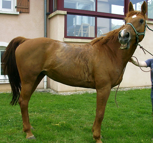 | Dire merci | c'est ce que j'ai fait. Elle était tellement mal avant que j'avais fait passer 2 vétos différents. Les 2 étaient unanimes. Trop mal à cause de l'arthrose. pour eux je devais la mettre sous antiinflamatoire plusieurs semaines par mois jusqu'à la fin. J'avais commencé, mais cela ne faisait aucun effet. J'ai fais des photos depuis le début.Malheureusement je n'ai pas de vidéo car pas de camescope. La jument revient à ma pension di'ci un peu plus de 15 jours. Clair qu'ils vont la trouver changer. J'ai bien l'intention de faire passer le véto ( il doit lui faire ses vaccins ) et de refaire passer les ostéos qui l'ont vu. Le simple fait de lui mettre la selle sur le dos la faisait tellement souffrir qu'elle ne mettait plus un pied devant l'autre même avec une cravache en main (si si le véto voulait que je la force un peu à marcher. ) Et depuis le début elle a fait 2 abcès. un au postérieur gauche et un à l'antérieur droit. Je pense qu'elle en fera d'autre aux postérieurs, vue l'état des pieds, mais les antérieurs, elle ne devrait plus en faire. |