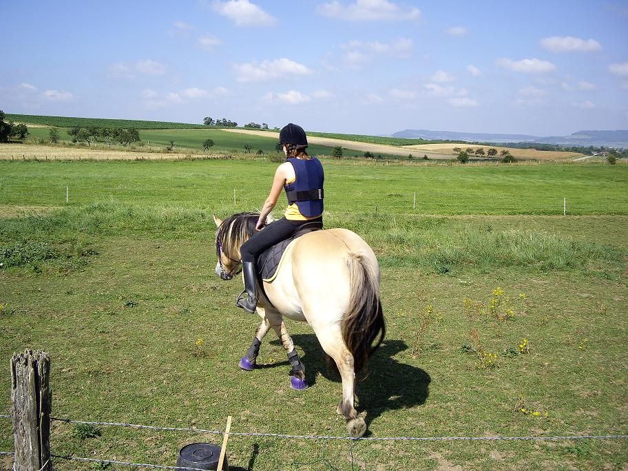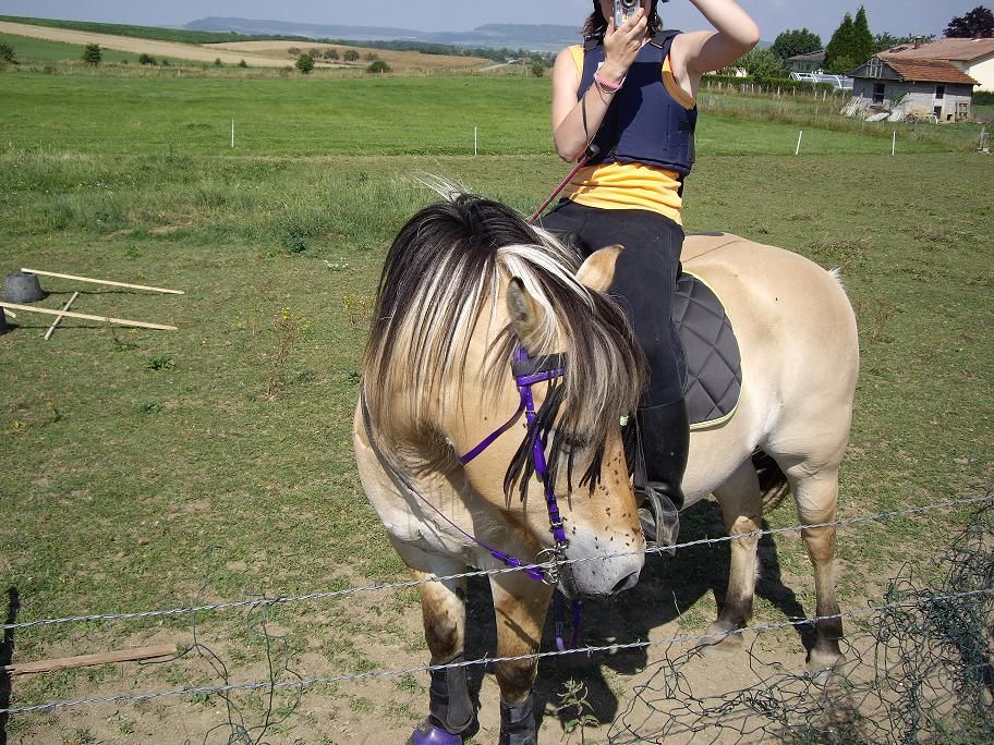 | Dire merci | moi, j'avoue que je flash plutot sur les iberiques et je ne cherchais pas vraiment un fjord quand j'ai acheté jason. mais un ami de mon père avait 2 fjords du même élevage que jason et on s'est fait de super balades avec les siens... vu que je ne trouvais pas chaussure à mon pied au niveau cheval au bout de 6 mois, j'ai fini par aller voir l'éleveur en question qui m'a présenté jason. première impression: il était tellement gros que j'ai cru que c'était une poulinière pleine ! mais ensuite, on a discuté une bonne heure avec l'éleveur, il était au milieu de nous en liberté dans la carrière, allant de l'un a l'autre, hyper proche de l'homme, ca, ca m'a séduite! et c'est toujours le cas: il adore le cadre familial et en pension, il n'etait pas malheureux, mais il lui manquait qq chose... niveau carctère, c'est clair que si il sent que le cavalier est trop gentil, il le mène par le bout du nez ... mais à coté de ca, il est super intelligent, très curieux de tout et c'est quand même bien agréable! bon, c'est aussi une tête de mule, mais moi aussi ! |