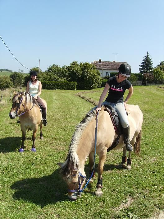 | Dire merci | J espere que Picsous aura été sage! je reviens juste, je suis partie en balade avec Fuego, en licol, adieu le mors ![]() c etait génial, ya pas à dire il est tellement mieux avec rien dans la bouche! aux 3 allures je le sens libre et léger, tellement bien. c est une révélation pour nous 2, c etait vrai en carrière et je le ressens encore mieux en extérieur ![]() mon amie Céline, avec moi, est elle monté à l indienne, à cru avec la cordelette! j espere réaliser ça moi aussi en extérieur bientôt |