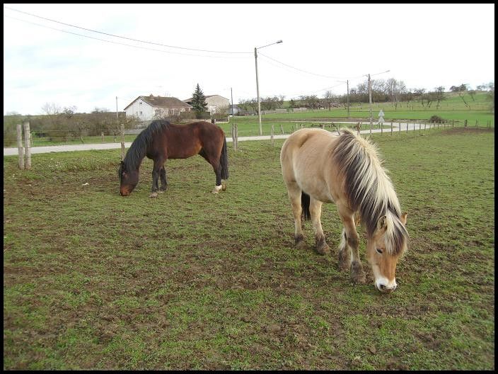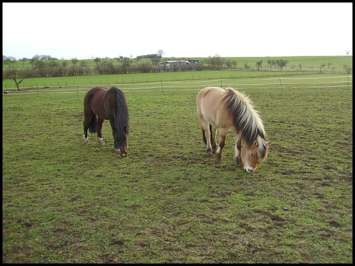 | Dire merci | ah ouais Inda a bien maigri! Et dis les pieds de Champion ça va mieux? Il boite encore? Bon pas de grandes news, comme d'hab... juste que c'est confirmé et officiel, Mira sera saillie par LASCO MAN (haflinger) cette année. Je ne ferai plus marche arrière, et devrait surement bousculer pas mal de mes projets, mais en même temps si ceux que j'ai en tête se concrétisent bah j'aurai pas trop de temps à lui consacrer pendant l'année à venir Je l'ai montée vite fait ce soir, dans MON champ fraichement cloturé (ce matin ), elle était presque géniale. J'espère que la rando de lundi se passera bien et je file me coucher avec les poules, je suis LESSIVéE |