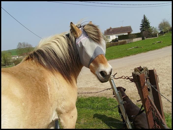| Dire merci | Coucou tout le monde!! Désolée pour le manque de nouvelles, j'ai pas trop le temps en ce moment et plus on ira vers la fin de mon stage moins ça ira! ![]() Kétie est très jolie! Je suis contente qu'elle aille mieux! Ondine79, la belle a l'air de s'éclater et toi aussi! Vous avee déjà de sacré belles fleurs par chez toi! darwing, tes photos sont superbes! C'est cool d'avoir une photographe comme ça! Sympa tes photos cici, j'aime beaucoup la première avec les deux genre "qu'est ce que tu fou là toi"! Pour ma part les gros vont bien, très bien même. Dimanche dernier Champion a bourré la clotûre car mon grand-père avait oublié de remettre le jus... A 9h30 le soir évidemment, en plein pendant les experts, c'est encore mieux!!! ![]() Du coup on est parti à la chasse dans l'autre côté du pré pour le rattraper! Et ce gogole courrait dans tous les sens, au moins il avait pas mal aux pieds! Indra était restée du bon côté et elle aussi s'éclaitait à courrir dans tous les sens! Aujourd'hui petite balade tranquilou au soleil, ça fait du bien! Et après j'ai été faire marcher Champion dans le village, en main, bah je suis agréablement surprise, il marche bien! On a même trotté sur la fin. Le maréchal passe cette aprem, hâte de voir ce qu'il va en dire!! Sinon la mauvaise nouvelle avec le soleil, c'est le retour des mouches, alors hop, j'ai sorti mes masques de compet'!! ![]() |