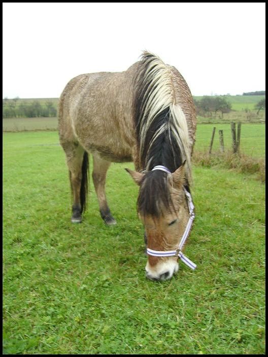 | Dire merci | Leslie, elle est superbe ta photo ! elle fait "sauvage" Laprince, j'imagine le bonheur de tes loulous, espérons qu'ils supportent bien l'herbe... tu es comme moi, toujours sur le qui vive ici, didine a bien repris après son virus, elle est en forme, a un beau poil, une belle corne et un moral d'enfer ! je ne sais pas si c'est le fait d'être à la maison, d'avoir des compléments cette année, mais elle est vraiment bien... ses hennissements me font toujours craquer le matin, et Sourire s'occupe bien d'elle, une vraie princesse ;-) ce week end, elle va bosser la grosse louloute ! |