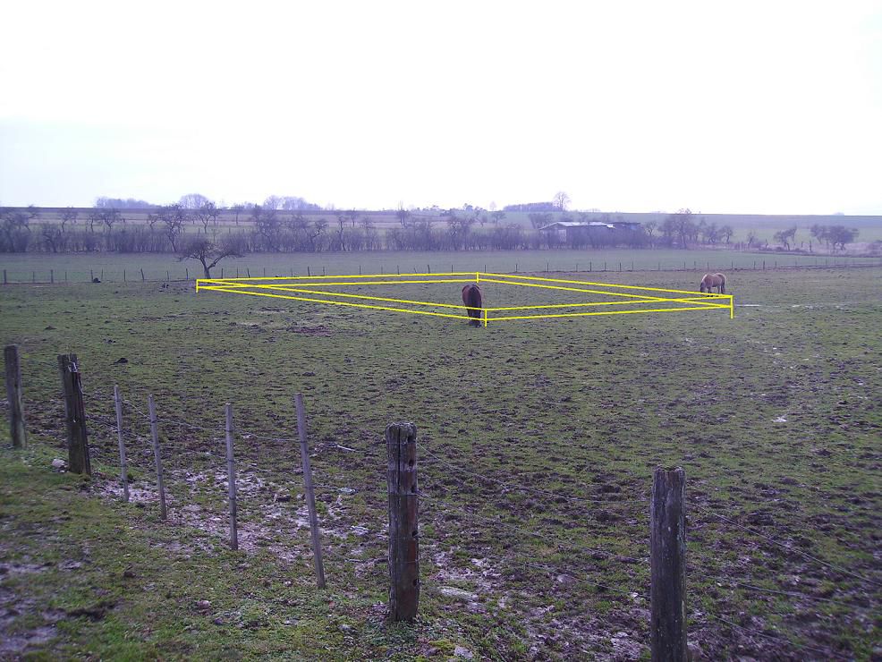 | Dire merci | Alors j'utiliserai ma carrière uniquement par temps sec, terre bien ressuyée. Je vais clôturer pour que les chevaux n'y aient plus accès (en même temps ça les forcera à marcher autour), ainsi l'herbe pourra pousser et faire un petit matelas. Enfin elle ne sera pas utilisée tous les jours loin de là et ne remplacera pas mes balades donc je pense que ça devrait aller. En hiver je pense que je démonterai tout. Elle fera 40X25. |