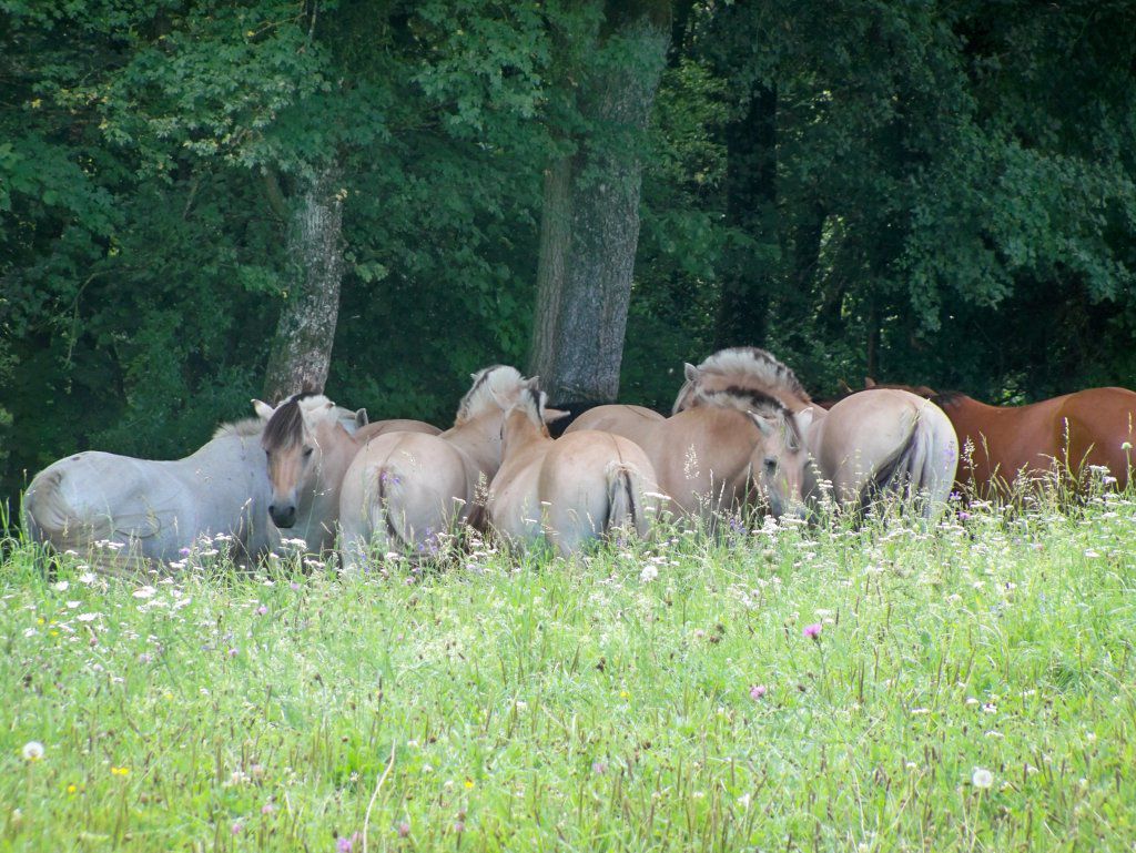 | Dire merci | Clair que le petit troupeau de fjord est Shalimar veux bien tremper les pieds dans un petit gué ou dans une rivière mais pas dans un étang...Je me demande si je vais pas lui mettre une bouée |