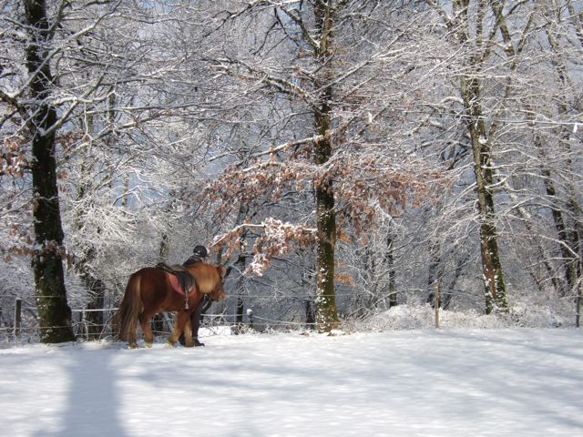 | Dire merci | Je rentre de balade! Et c'est bien comme je pensais, ça me fait encore plus douter pour la vente... Ben oui, il a été exemplaire : moi je ne l'avais plus monté depuis le mois de mai dernier (oui oui!), et entre, il a été monté une fois, il y a plus de 2 mois, par un type qui était venu l'essayer. On avait juste fait une mini balade puisque j'avais eu une urgence peu après être partis. Je l'ai sellé bridé, j'ai marché à côté pour traverser le village, et pas trop de soucis au montoir, j'ai du m'y reprendre plusieurs fois pour l'avoir calme, mais j'ai pu monter sans qu'il ne bouge. On a fait un peu plus d'1h, il a été super chaud comme toujours, il a son caractère, il est pas facile facile, mais il s'est quand même super bien comporté... Je m'en sors avec lui parce que je le connais par coeur vu que c'est moi qui l'ai débourré, mais quelqu'un d'autre qui monte dessus, il a du mal à le maitriser... Et j'ai fais des photos en revenant de balade Message édité le 16/02/10 à 19:03 |