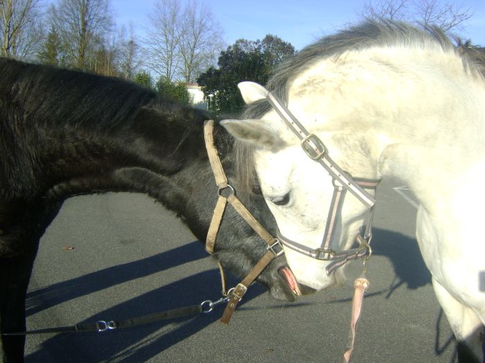 | Dire merci | Coucou tout le monde !!! Joyeux Noel !!! Pitch fffiou quel beau gosse ton Sibellius (orth ? ) ! ![]() " Moi j'essai d'habituer mon S à la douche et c'est très très sportif il devient hystérique rien qu'en voyant le jet ! Et sinon mardi castration !!!!! " La Tiz aussi etait histeriques quand j'essayais de la doucher ! Pour la desensibiliser , j'ai d'abord regardé ce qu'elle craignait le plus donc : je lui ai montré le tuyau a blanc = no prob , avec de l'eau = gros prob ! Et en fait j'avais remarqué que c'etait la venue de l'eau ( surtout froide ^^ ) qui la genait ! Est ce pareil avec ton Sibel ' ?( Sibeau ! )Si c'est le cas , travaille d'abord la venue de l'eau avec un torchon mouillé ou un sceau en faisant des gestes avant/arriere et petit a petit tu y rajoutes le jet d'eau ! En tout cas : bienvenu chez les S ! ![]() Sinon la Titiz va bien , je peux poser ma longe par terre et lui demander l'immobilisation elle se barre pas ! Puis hier elle m'a fait marrer : pour la sortir du parc il faut passer par un couloir , du coup j'en ai profité pour lui mettre la longe sur l'encolure et voir si je pouvais lui faire confiance et surtout voir si elle allait me suivre ( en meme temps une Tiz qui ne me suit pas n'est pas une Tiz !) . J'avais mis mes bottes de pluie a cause de la boue , donc quand je marche je suis obligé de lever les jambes car ca s'enfonce . Sauf que Poulichette en voyant qu'elle etait laché + me voyant faire ca elle a pas trop capté donc elle s'est mise a m'imiter et m'a fait un BEAU pas espagnol !J'avoue que je suis resté tres bete : elle connait la jambette des deux cotés ( aussi appris par imitation sans aucune volonté de ma part ... ) et la seule fois ou elle m'a fait ce meme genre de chose c'etait quand je m'etais planté dans mes codes il y a quelques mois : je voulais lui demander d'avancer mais j'avais dirigé mon stick sur l'anterieur au lieu de l'epaule ( puis j'ai pas dit le mot magique ! ) et du coup elle m'avait fait deux jambettes en avancant ! De jour en jour elle m'epate ! Comment ne pas en etre gaga de cte poulichette ? |