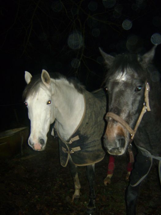 | Dire merci | Jadou : j'aime beaucoup la tête de on loulou, je la trouve expressive ! Je suis sûre qu'il présentera encore mieux au printemps une fois tout son poil d'hiver enlevé ... et ses dreds locks lol. Mufty : C'est sûr qu'un Alezan ça flash moins qu'un chocolat ... mais c'est pas le même prix non plus. Et puis lui il a beaucoup d'autre qualités et finalement vu qu'il a les crins lavés ça rattrape (je pense qu'il a le gène silver qui fait ça ... parce que quand on y regarde de prêt c'est pas un alezan crins lavés comme les autres). Peut-être un jour un jument chocolat ... et des poulains lol. |