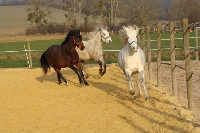| Dire merci | Ensuite on a travaillé en liberté, je voulais voir si elle était sensible à mon attitude et à mes gestes sans qu'il y ait contact entre nous....et surtout voir sa confiance en moi. Alors d'abbord avec le fouet qui me sert de stick pour la diriger...elle m'a fait de superbes cercles autour de moi au pas, au trot et meme au galop. Allures montantes et descendantes nickel et l'arret très bien aussi. J'ai commencé le changement de main, pas mal du tout! Pourtant elle avait la place dans la carriere pour m'esquiver, aller voir ses congénères et aller brouter, ben non j'ai une bonne place de leader apparemment et nos exos lui plaisent bien! ![]() ![]() ![]() Puis on joue toutes les deux à "Suis moi".. je fais pleins de voltes, de virevoltes, à droite, à gauche, pleins d'arrets...1ere fois pour nous et j'ai haluciné comme elle me suivait, elle s'éclatait..et moi aussi Au moindre arret, elle s'arretait à mon épaule ![]() on rentre toutes les deux la tete, on est super synchro dis donc ![]() Bon c'est vrai je cours pas très vite ![]() ![]() En tout cas c'est sûr j'étais plus creuvée qu'elle Bon voilà de simples moments que tout le monde peut vivre mais que j'ai aimé ![]() |