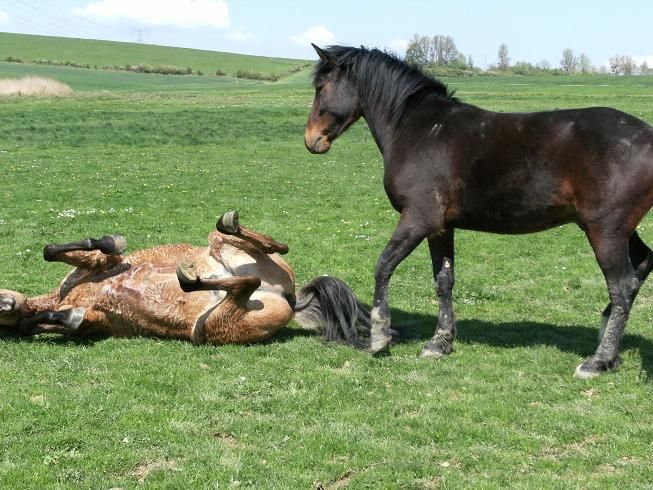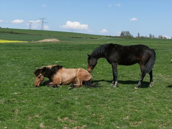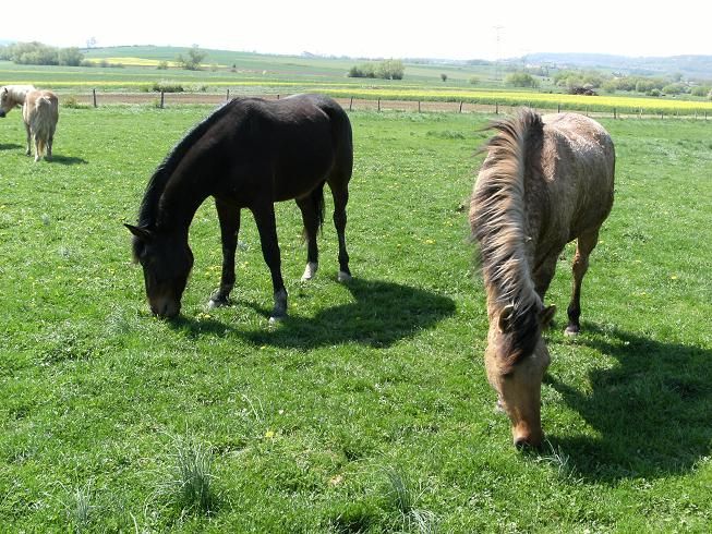 | Dire merci | en effet, ça pousse ici!! Pour le shadow, avant hier, séance de longue rênes: Un loulou très attentif et calme qui ne chercher qu'à faire bien, ça se voyait Hier, je l'ai monté, on a refait un séance de longe aux trois allures. Un loulou encore super calme qui fait très bien son boulot, un galop ...equilibré, décomposé...mouahhhhh, j'adoreeeeee!!Puis laché, d'abord au pas. Le loulou était tout mou! On a fait plusieurs transitions, marcher sur la piste puis de nombreuses figures de manège puis au trot...idem, il fallait le poussé le crapaud! On a fait des cercles et des transitions...Adorable Aujourd'hui, je pense que ça sera ballade jusqu'à village pour lui faire connaitre les voitures!! ![]() au moins, je pourrais mitrailler!!! Ah oui, sinon au pas, j'ai retiré mon manteau en le secouant dans tout les sens sur lui, il n'a pas bougé. et au pas, trot, taper dans les mains..il s'en contrefou!! ![]() ![]() PS: regardez bien son encolure, il est pommelé ![]() |