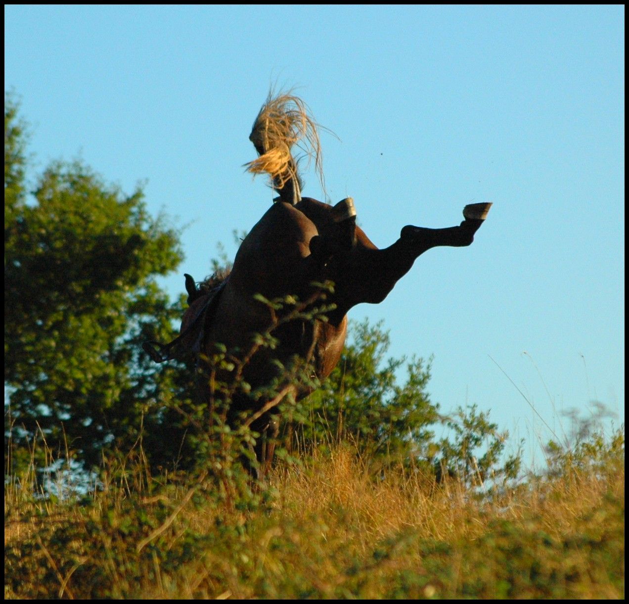 | Dire merci | bah ça continue j'ai pris une chambrière qui trainait dans la carrière, je n'ai pas vu qu'on avait fait un noeud au bout du fil... ce qui fait que quand je l'ai secouée, bah avec la force du noeud je me le suis pris dans la tronche mais violent hein. Les chevaux ont bien rigolé |