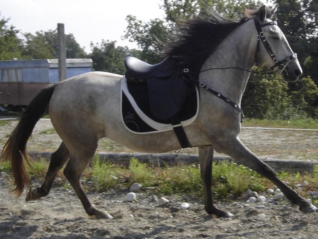 | Dire merci | Coucou ! aujourd'hui j'ai bossé Ravageur (ça faisait 2 semaines) On est allées le chercher au parc, en main, puis j'ai vu un beau champ et j'ai pas resisté.... On a galopé en main c'était GENIAL !!!! donc on part au trot, on accelere, et le je dit 'galop' et il prend le galop !!! ![]() on a fait un virage, et apres dans la ligne droite il m'a regardé, a allongé les foulées et à tenté de doubler...... il s'est pris le stic sur le nez et je me suis arretée net, je l'ai stopé, et fait reculer stic au poitrail. J'ai attendu un peu voir s'il était calme, et on est repartis (il a pris le galop du pas !!!! ![]() ![]() ) et il respectait bien la distance, et pour pas me doubler il prenait un petit galop rassemblé et à un moment, il a fait le beau, a levé les epaules, et à galopé equilibré sur les hanches, par petites foulées rassemblées en montant haut les épaules !!! il est MAGNIFIQUE !!!!! (oui je cours en regardant derrière moi, c'est bien connu y'a pas d'arbres dans les champes !!! )puis on a soufflé un peu (surtout moi ) et lui n'était pas du tout exité, il redescent très vite la pression ! on est arrivés chez moi, on l'a sellé + filet et hop au rond de longe. Il a été GENIAL. Mais es juments étaient juste à côté (il est encore entier ) alors il a fait un peu le quéqué au debut, il n'etait pas 'naturel" (d'habitude il manque d'impulsion )- au pas, il m'a fait au moins 4 cercles calme, en avant, sans couper le cercle !!!! ![]() - Puis au trot, bien cadencé, part au trot a la voix + mouvements d'épaules/bras en avant. difficultée a repasser au pas du trot, il est dans son truc, et quand j'insiste en me deplacant beaucoup vers son épaule et s'arrete net au lieu d'aller au pas. Alors je dois le remettre en avant, et souvent il part direct au trot.... il a du mal le pas. Du coup j'anticipe, quand je vois qu'il va me 'voler' le trot, je le lui demande ![]() - galop super, il part facilement et a beaucoup d'equilibre. Il part au mouvement de bras et du corps vers son cul. Par contre il fait l'imbécile... Secoue la tete, balance les antérieurs, minis cabrés, sauts non repartoriés ( ) etc.... je sais pas si je dois le laisser faire ou pas..... Je dirais plutot non, mais je ne veux pas etre rebarbative et le lasser de la longe.... Il est content, où est le mal ? (tant que les pieds ne me sont pas dirigés bien sur et qu'il reste attentif pour une transistion)Bref je sais pas trop quoi penser.... ![]() Puis j'ai fait une superbe transition galop>trot>pas>arret et j'ai fait l'autre main. Plus chiant au pas (reviens vers moi, broute....) et au trot la tête vers les juments galop, il est allé à fond la caisse à un moment, mais je l'ai laissé faire, il a ralentit de lui même et j'ai entretenu le galop jusqu'a la transition au trot, puis au pas, arret et venir vers moi au centre (je m'accroupis). Mais neammois un cheval attentif et reactif, je me sers surtout de mouvements corporels pour le faire accelerer ou ralentir, la voix n'est pas encore au 1er plan. |