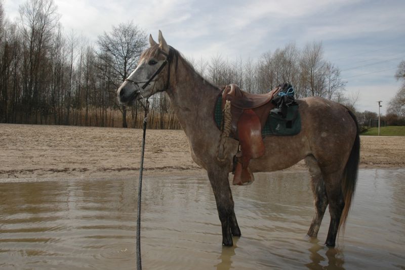 DéconnectéDire merci | Une petite photo pour faire plaisir à Comet ! C'est dimanche, juste avant la pause casse-croûte (la photographe a dû rentrer pieds-nus dans l'eau glacée pour y faire rentrer sa mûle... )Admirez les fenders (assortis à la selle...) et les latigos (en ficelle de botte de paille !) On fait avec ce qu'on trouve ! ![]() Le tapis physio se cache sous le tapis à sacoches. ![]() |