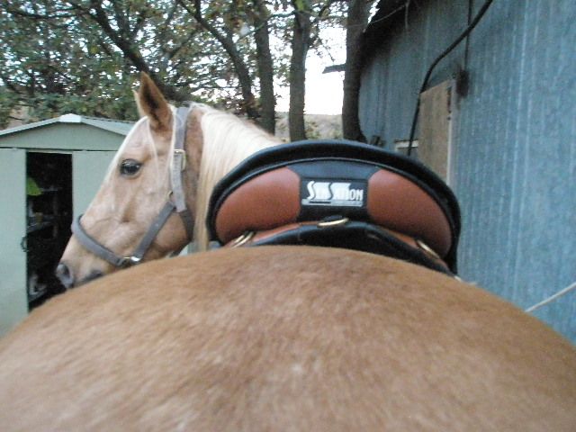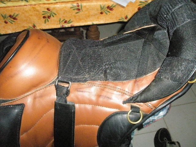 | Dire merci | Pour voir je n'ai pas mis de tapis,mais il en faut un 'special sans-arçon'pour bien faire.![]() Au garrot,je passe 2 doits. ![]() Jodi n'a pas voulu se tenir droit ![]() Attache de sangle,ça pars dans 2 sens mais difficile de dire par ou ça passe exactement. ![]() Deuxième atache des etrivières,ça doit quand-meme bien repartir le poids. ![]() Voila!Impatiente de faire un tour avec.... |
