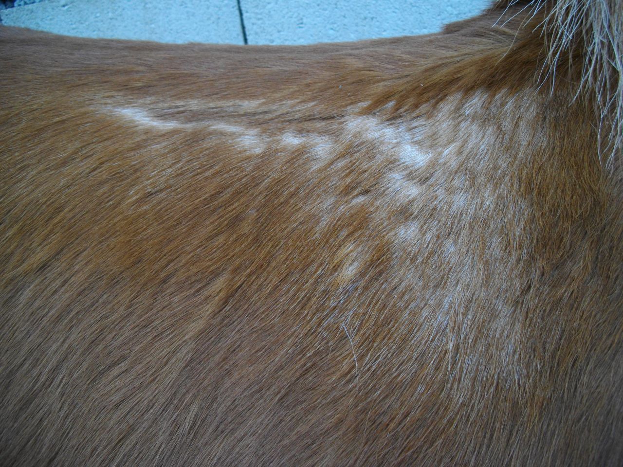 les poils sont tombés et ça a repoussé blanc pour moi (sur le cas de mon cheval, ça vient du système de fixation des étrivière qui un point de pression à un seul endroit, c'est pas assez répartit.