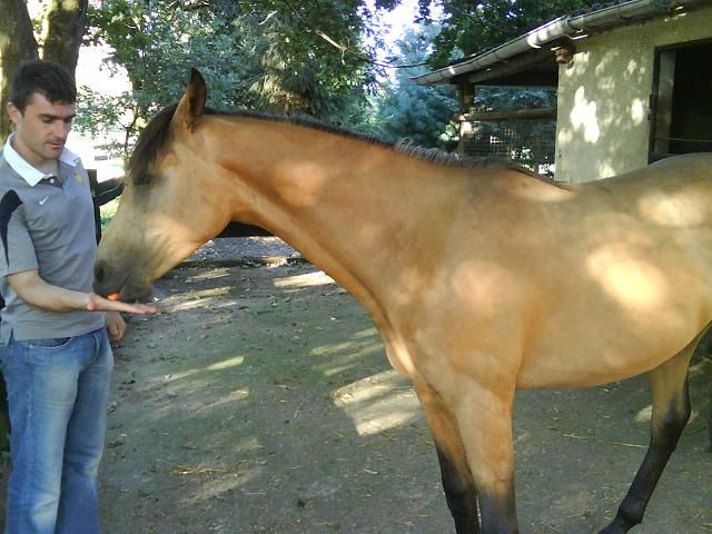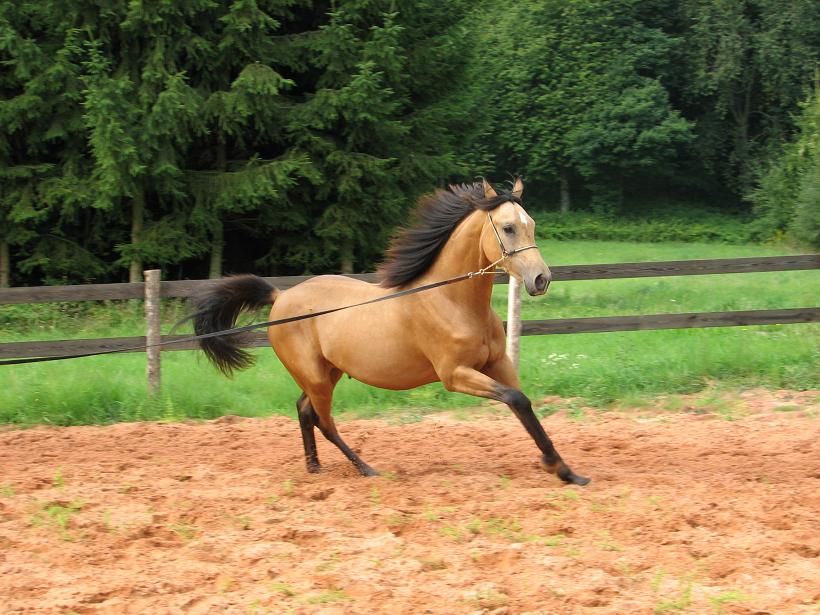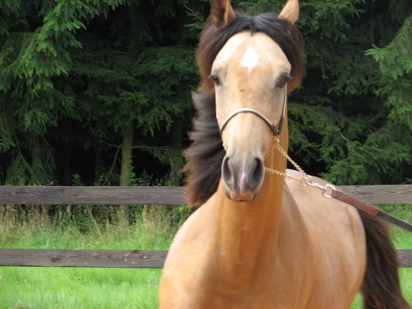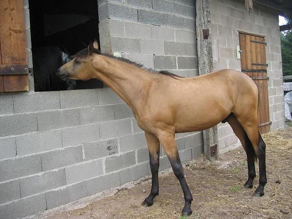 | Dire merci | Le père du premier, c'est DJEBEL DE L'ARDUS. La mère était Cheval de Selle. Le premier est le demi frère (par la mère) de la palomino, mère de l'isabelle. Le petit isabelle est un fils d'ALMOUTALIB VALMONT (apparenté aussi à DJEBEL). Donc ces deux DSA sont apparenté par le père et par la mère. On espère que le jeune isabelle ait les mêmes qualité physiques et mentales que le bai. On le voit moins maintenant mais le bai quand il était encore poulain (c'est un M), il avait des crins et l'extrémité de la queue gris. Sinon, il a très peu de blanc. Le petit isabelle a des crins ivoire dans la queue et la crinière. |
