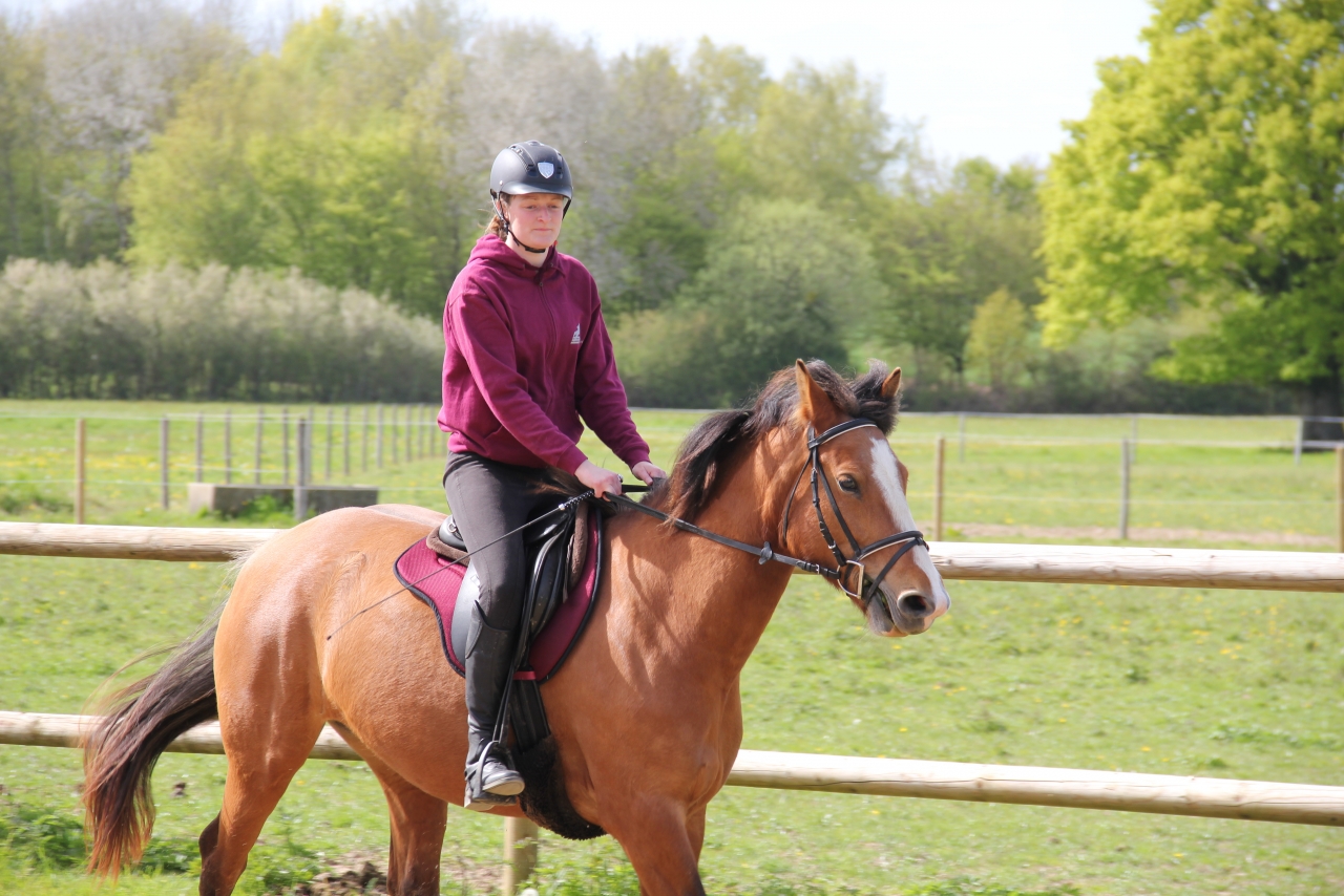 | Dire merci | jolinar trop mignonne Jo avec le petit! C'est fou comme ils sont gentils avec les enfants nos FM! Effectivement elle a des kilos à perdre mais c'est vrai que ça n'est pas évident! Lorsque j'ai du faire maigrir rapidement ma Fjord, la seule solution qui fonctionnait c'était le paddock en terre avec ration de foin. Et une fois qu'elle avait commencé à bien maigrir, trottings. Sinon c'était le dernier cours des vacances hier. Nous avons travaillé dans le calme, sur la précision du tracé en faisant des cercles et changements de direction dans des couloirs de barres au sol. Chicane était plutôt calme, le temps chaud aura adoucis ses ardeurs habituelles. Ma monitrice souhaite que je fasse un nouveau travail sur moi concernant ma position. Il faut que j'ai un meilleur contact dans mes bas de jambes, les coudes pliés plus régulièrement (car j'ai tendance à monter les bras tendus) et que je m’asseye au milieu de ma selle car je monte très en arrière. Autant vous dire qu'elle va devoir me répéter tout ça car au bout de deux tours c'est envolé et je me concentre sur autre chose. Afin de compléter tout ce travail nous avons évolué sur une serpentine, chose que nous allons pouvoir reproduire à la maison et que Chicane réussi plutôt bien maintenant, elle a un peu gagné en souplesse. Enfin, nous avons galopé plutôt dans le calme en effectuant des cercles et en passant dans les couloirs de barres au sol. L'autre jour nous avions galopé en passant sur la bâche, elle progresse vraiment bien en ce moment! ![]() ![]() Sinon les chevaux disposent enfin de leur nouvel abri dans leur grande pâture: ![]() Chichi refait à nouveau une uvéite. Donc masque toute la journée même s'il n'y a pas franchement de mouches mais ça fait anti UV et pommade en attendant que ça passe. |