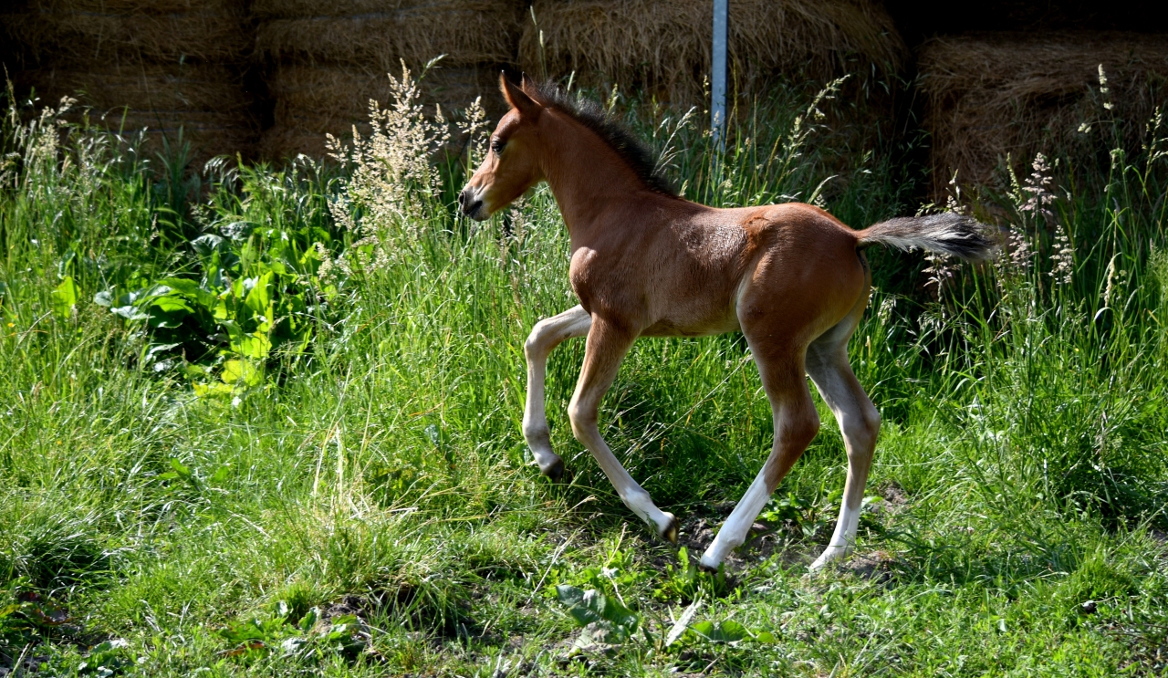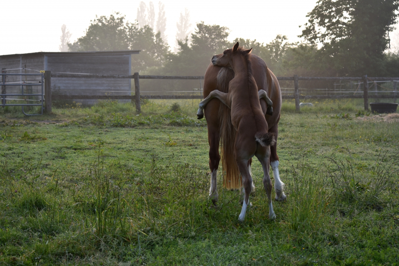 | Dire merci | Il a trois balzanes les deux postérieurs et l'antérieur gauche, sinon les membres qui vont être noir sont toujours clair à la naissance, c'est quand ils perdent leur poil de poulain, que la couleur définitive arrive, c'est comme les vrais noir, ils naissent gris souris... donc le membre doit qui est clair, sera en fait noir... en tout cas Itune lui il continu ses apprentissages ![]() |