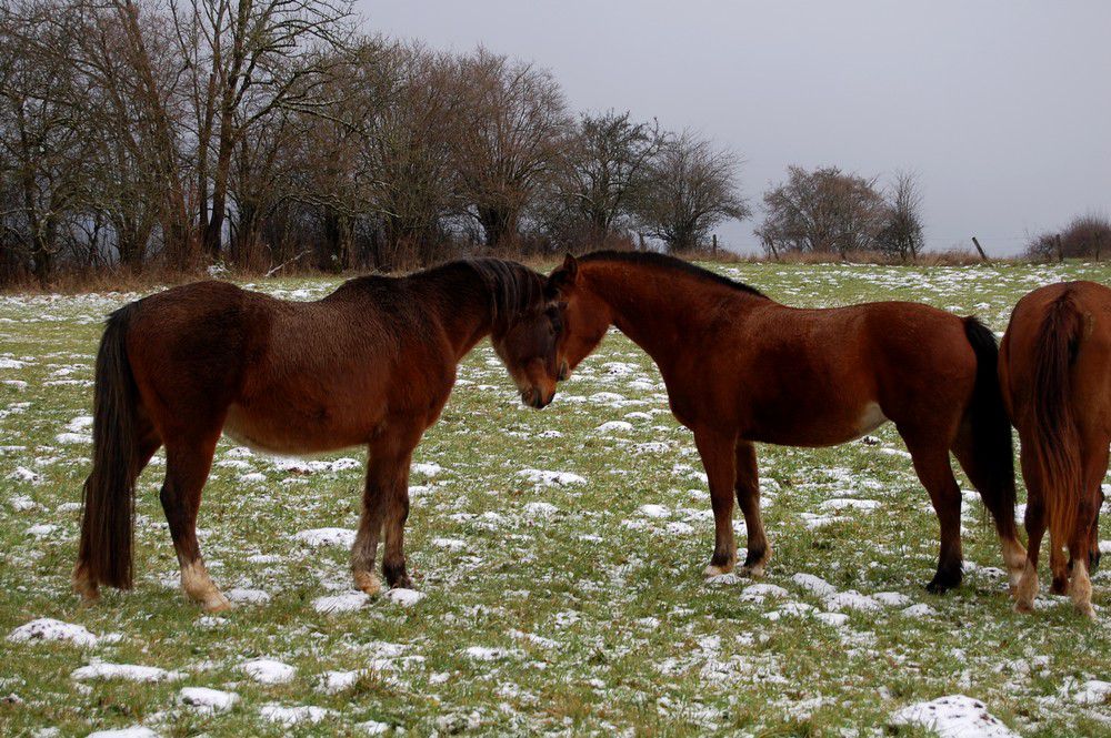 | Dire merci | Nous on est plutôt dans la boue ![]() Et encore ils ont de la chance, leur pré reste très correct... mais l'accès en voiture est difficile et les chemins sont complètement défoncés, aquatiques, glissants... Donc ils glandouillent pas mal... balades quasi au pas uniquement ![]() On a quand même eu un peu de neige : Fany ![]() Kachou ![]() |