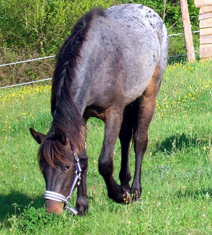 | Dire merci | ma jument est une bay roan. (elle est née baie avec des crins noirs LoL) Elle est seulement half appaloosa ( son pére était un appaloosa léopard) j'ai des photos plus parlantes en stock mais je n'arrive pas à les retrouver. |