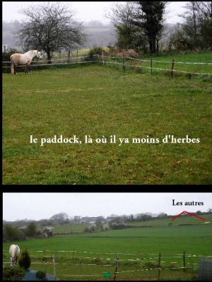 | Dire merci | Merci pour tes explication El Bimbo, mais je sais que j'ai été négligente au sujet de la double ponette de ma fille, j'ai deux chevaux depuis 1 an et demi seulement et je m'y connaissais pas beaucoup, mais j' étais très entouré de personnes qui s'y connaissaient très bien et qui voient mes chevaux toutes les semaines mais eux aussi n'ont pas réagi assez vite. Donc, en attendant de lui trouver un masque, ce matin je l'ai mise au "paddock" près de la maison, (moins d'herbes) je pensais qu'elle ne serai jamais resté, habituellement dès qu'elle se retrouve seule elle fonce dans le fils (avec ou sans courant) mais là rien, le champs des autres sont au loin, elle les voit, c'est sans doute pour ça, et il n'y a pas de courant dans le fils. (photo) Les enfants sont en vacances, ils jettent un coup d'oeil de temps en temps, et je suis également là pour surveiller, par contre la nuit ... ![]() J'espère qu'elle restera sage. ![]() Mais je ne sais toujours pas ou je peux commander un masque ? |