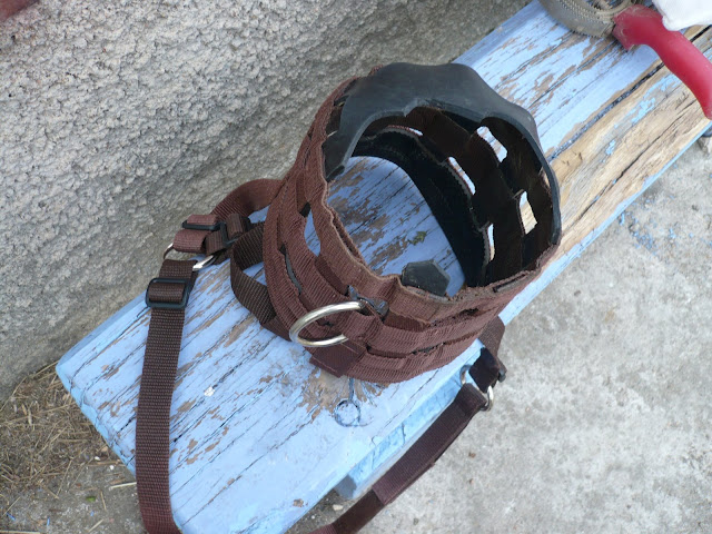 | Dire merci | .... état du "panier" après 23 minutes sur le nez du haflinger ... sous surveillance... Il a compris qu'en marchant TRES activement en frottant de toutes ses forces le panier sur le sol ... ben ça tient pas ... poney 1/muselière 0 ... |