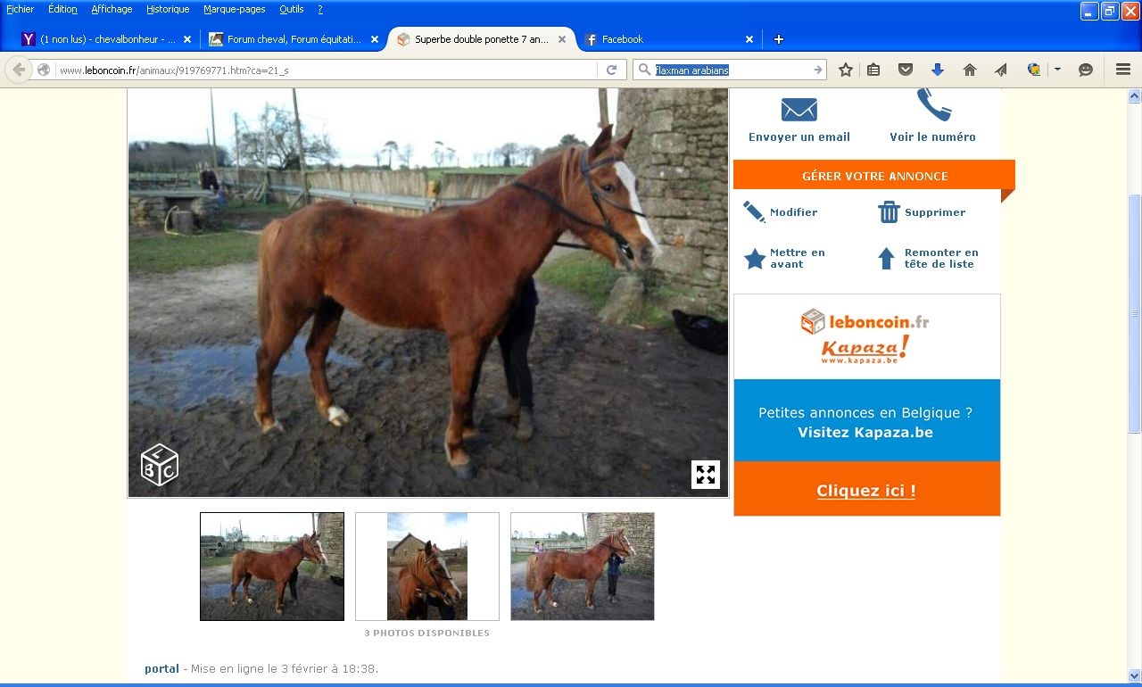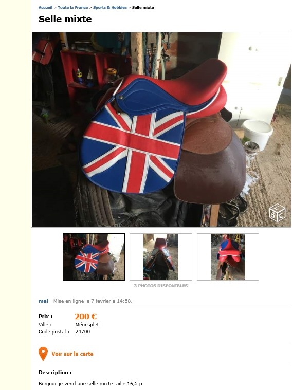 | Dire merci | conny J'avoue que parfois certaines annonces me font tellement bondir que je ne peux résister a l'envie d'envoyer un e-mail salé. Mais je me dis que c'est peine perdue car dans 99% des cas l'émetteur de l'annonce est persuadé d'avoir raison ![]() Je suis en plein litige sur un achat merdiq*e: Le vendeur a mis une photo qui n'etait pas ce qu'il vendait...Ca fait 10 jours que j'essaie de me faire rembourser "a l'amiable" mais en vain parce que le bonhomme est persuadé que c'est la même selle envoyée et en photo sur l'annonce. Sans oublier qu'il a mis 1 mois a l'envoyer Voici le résultat par image: ![]() ![]() Même un enfant de 5ans verrait la difference.... Alors quand je parle de tête de mul* je sais de quoi je parle... |