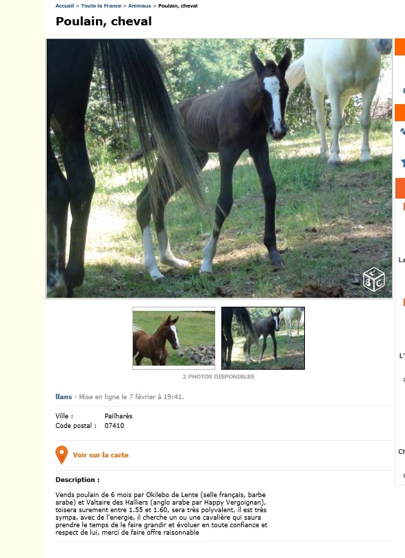 | Dire merci | et le vendeur met en avant le fait qu'il sera plus tard un cheval polyvalent. ?il n'a pas trouvé mieux comme photo? Ok, ben si tu l'achètes à 6 mois avec l'espoir d'en faire un cheval de sport, t'as intérêt à faire un bon contrat de vente ! (je sais que ca peut se redresser, rentrer dans l'ordre etc, mais perso, ca me refroidirais si je devais être acheteuse) |