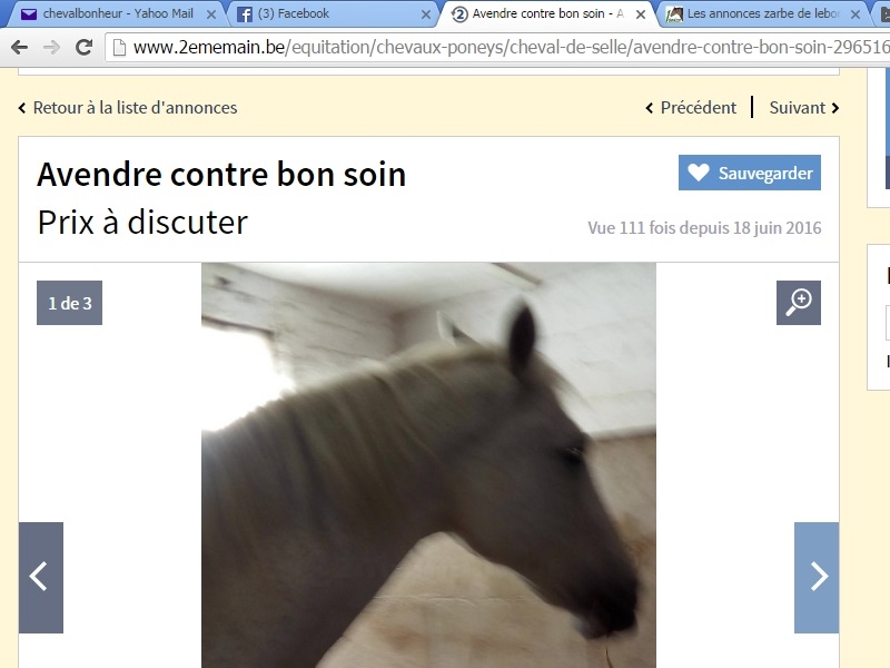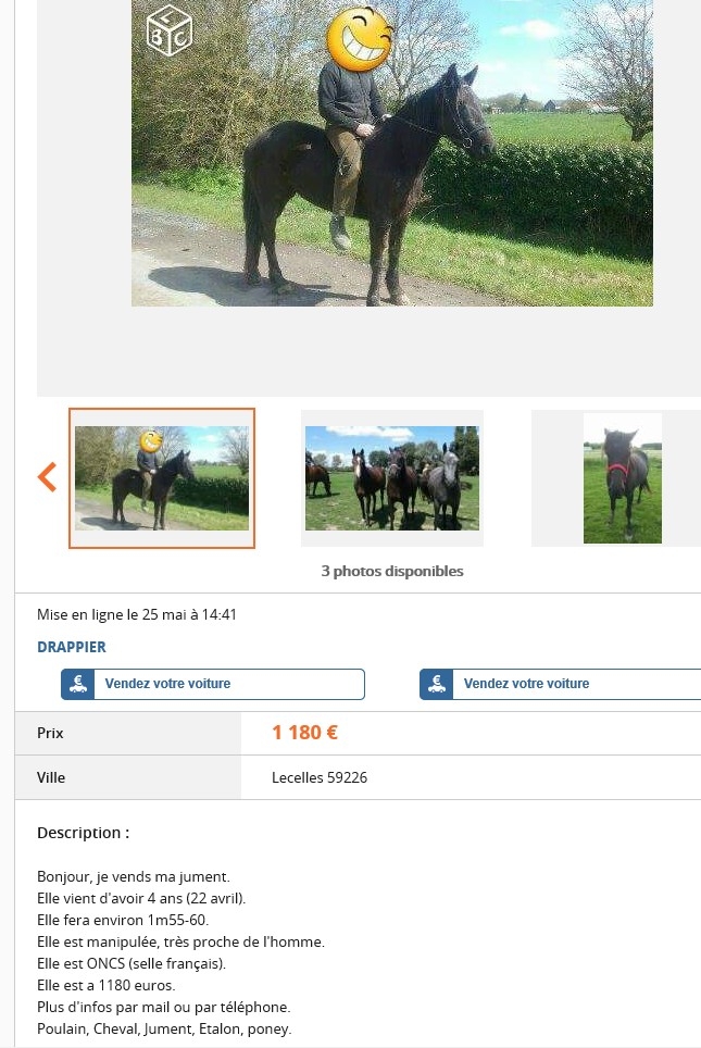 | Dire merci | De l'écurie de propriétaire à la boucherie en moins d'une semaine! ![]() Expéditif! Lien "Poney a donner contre bons soins Description : Poney ONC 5 ans entier ayant deja sailli , respectueux en main, proche de l homme débourré aux 3 allures vivant en écurie de propriétaires ... habitué au pré complet ou bien boxe/paddock Castration si besoin et transport a votre charge Je ne peux plus payer sa pension TRES URGENT SINON PART A LA BOUCHERIE FIN JUIN" |