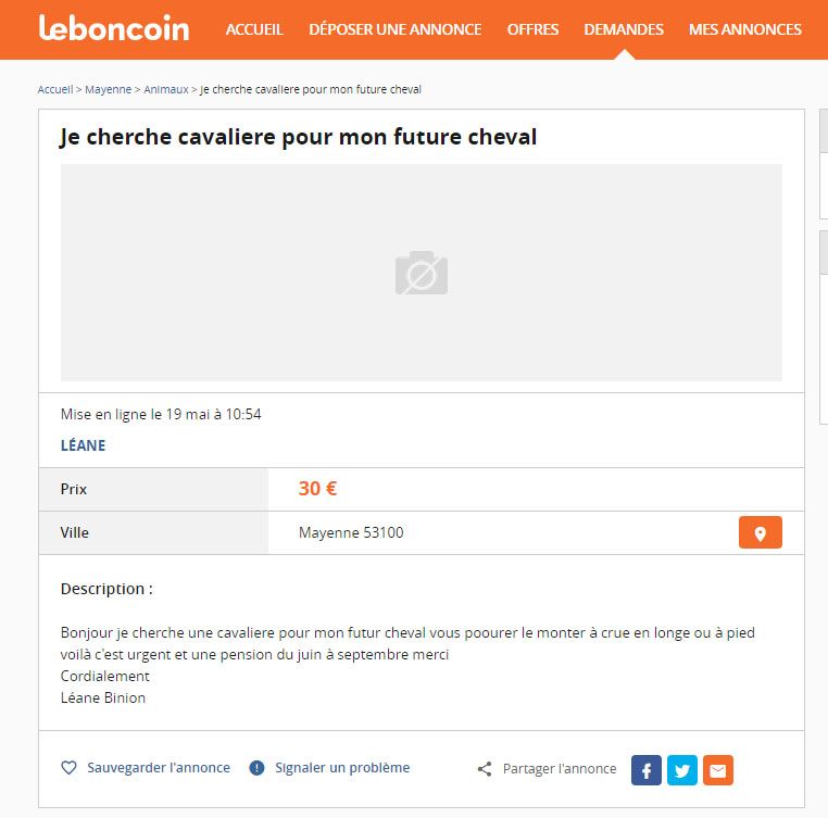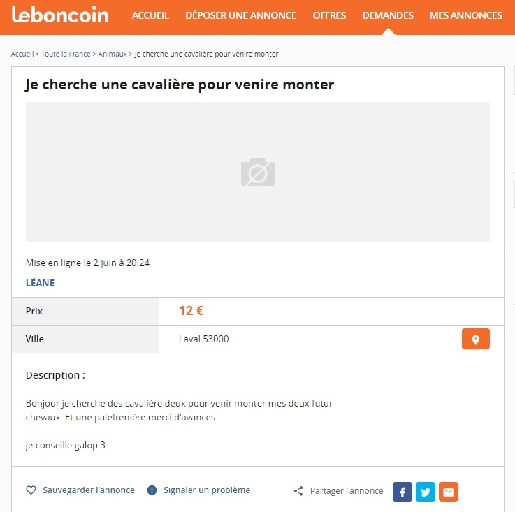 | Dire merci | Excellent les annonces Donc en gros la fille elle recherche des chevaux, des cavaliers pour monter ses chevaux et un palfrenier pour s'en occuper, un transport et tout ça gratuitement, alors si vous savez pas quoi faire.... et que vous avez le galop 3 |