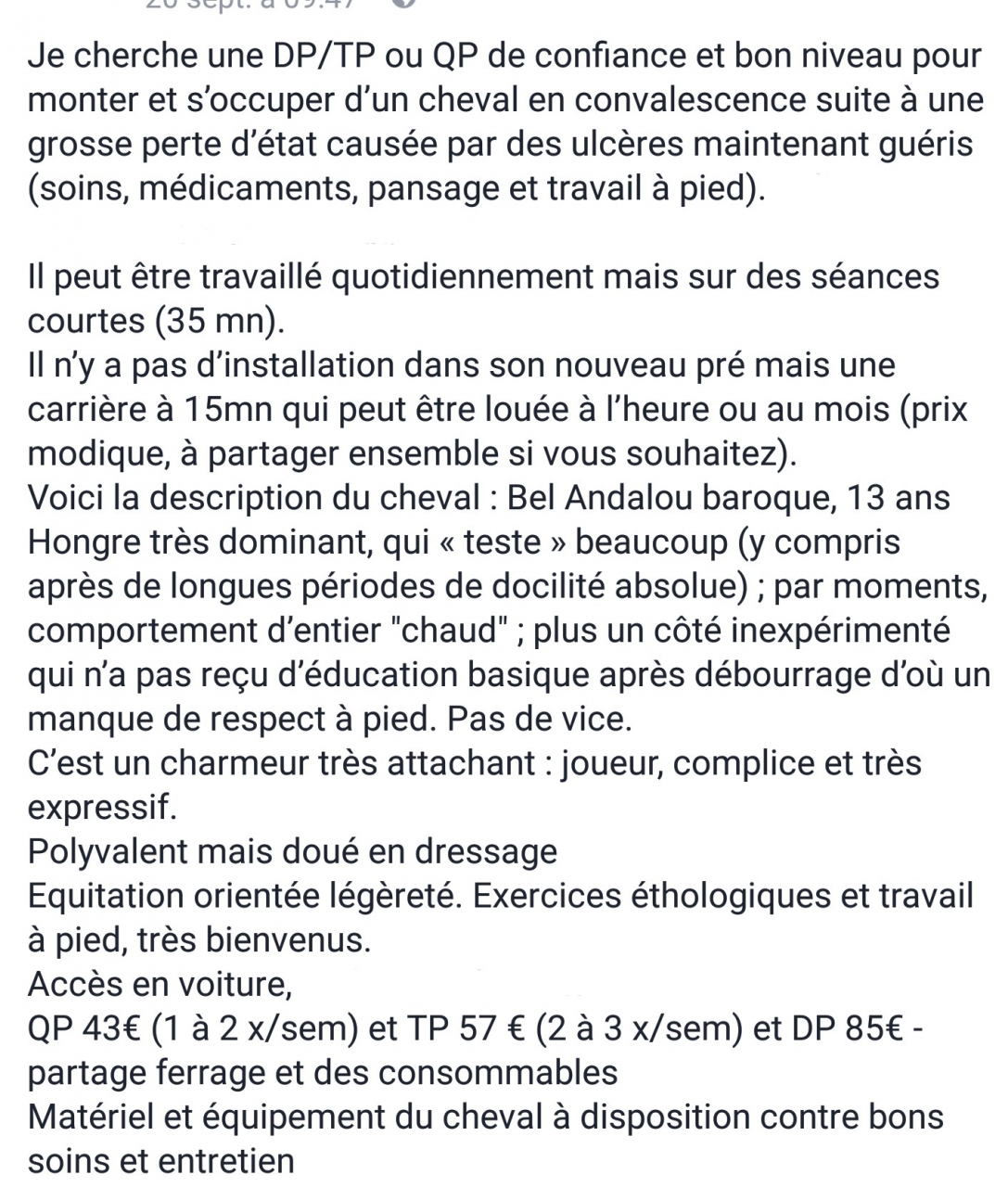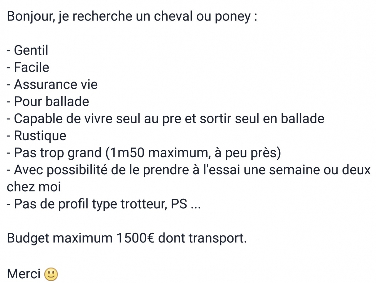 copier collé : Prix: 40 € Code postal: 62250 licol avec longe acheter a decathlon pour cheval .mon prix est de 40 euro