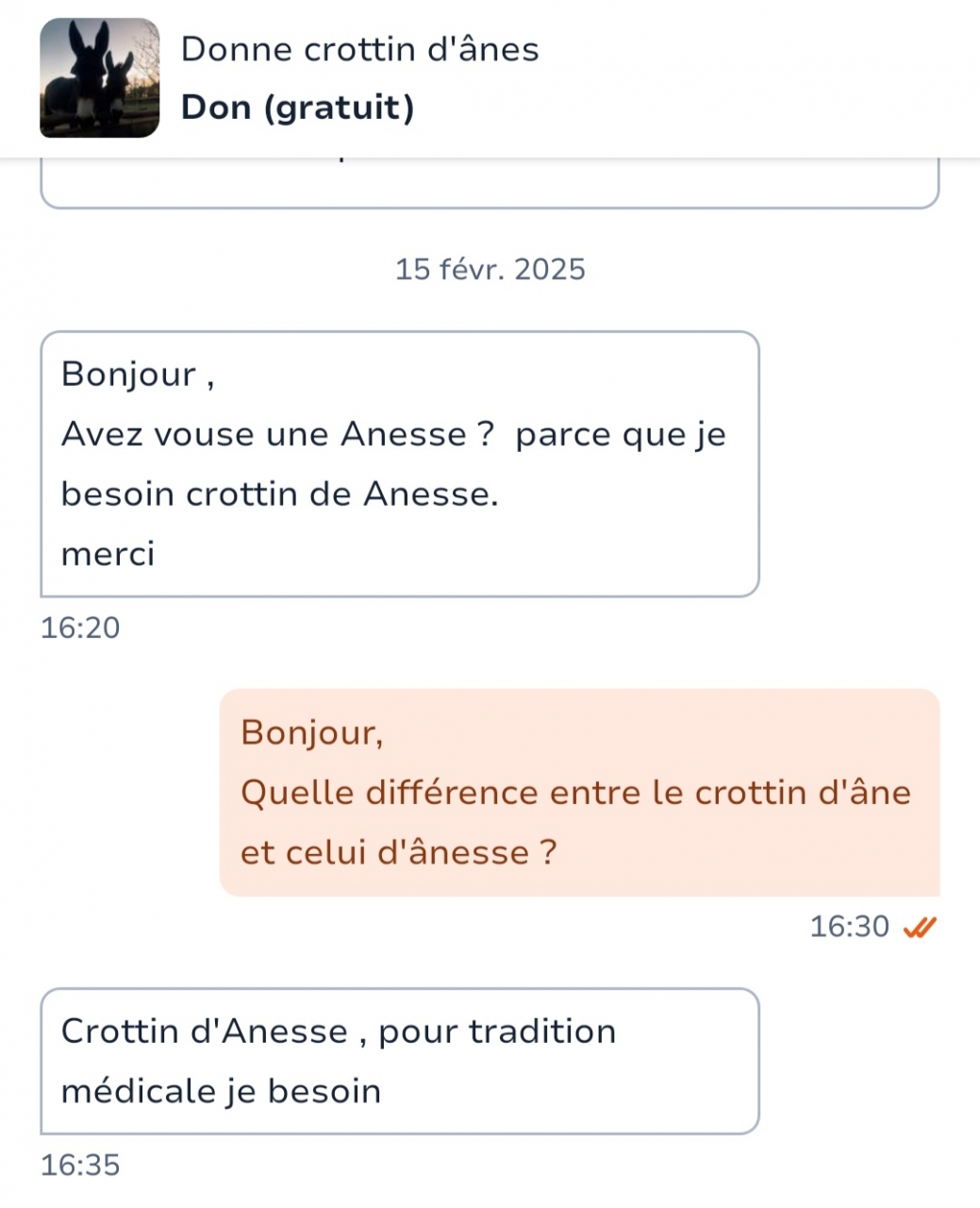 | Dire merci | Allez, je partage Je donne le tas de crottin pour les jardiniers, ça me débarrasse. Voilà le message que j'ai reçu aujourd'hui, en 7 ans on me l'avait encore jamais faite celle-là ![]() |