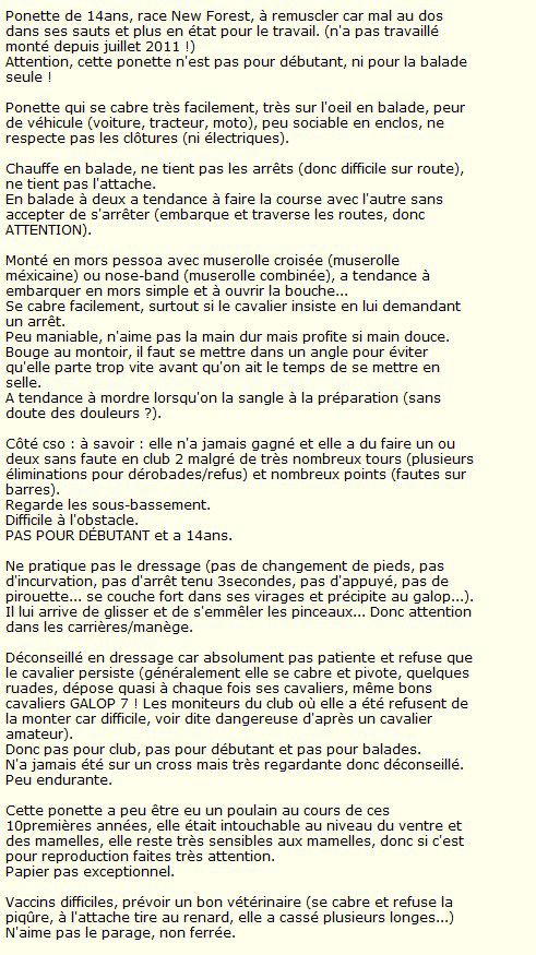 | Dire merci | C'est peut être aussi une personne rageuse qui a mis une photo des débuts de la ponette, comme s'en est justifié le vrai vendeur. Faut pas jeter la pierre au vendeur en disant qu'il est malhonnête non plus. Certes, visiblement les résultats ne sont pas foufous sur la FFE, et 7000€ ça fait cher alors, mais rien ne prouve qu'elle est réellement dangereuse.. |