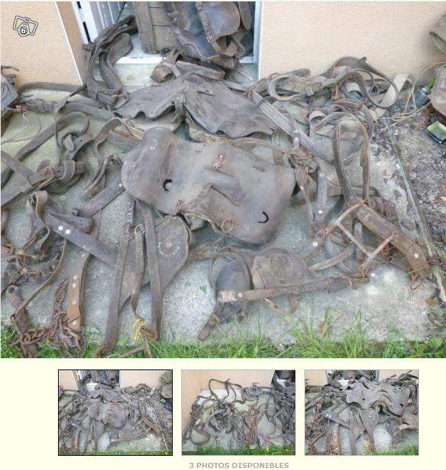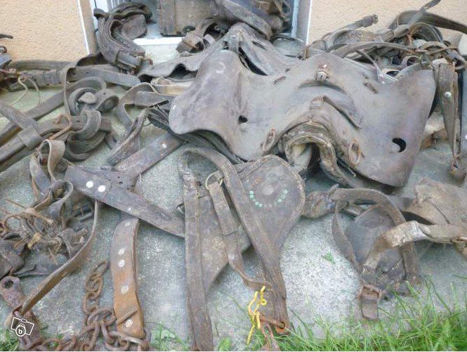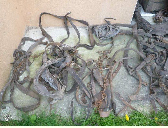 | Dire merci | Du materiel agricole,il y en a a la pelle dans les granges! Un ami agriculteur (il y a longtemps)avait achete l'equipement complet de 8 chevaux de trait de travail aux encheres pour 5f... Et le matos n'etait pas sec du tout, bien entretenu...il voulait faire des colliers a veaux avec et m'a laisser recuperer tout ce que je voulais ... J'etais aux anges devant ce tas de cuirs! |