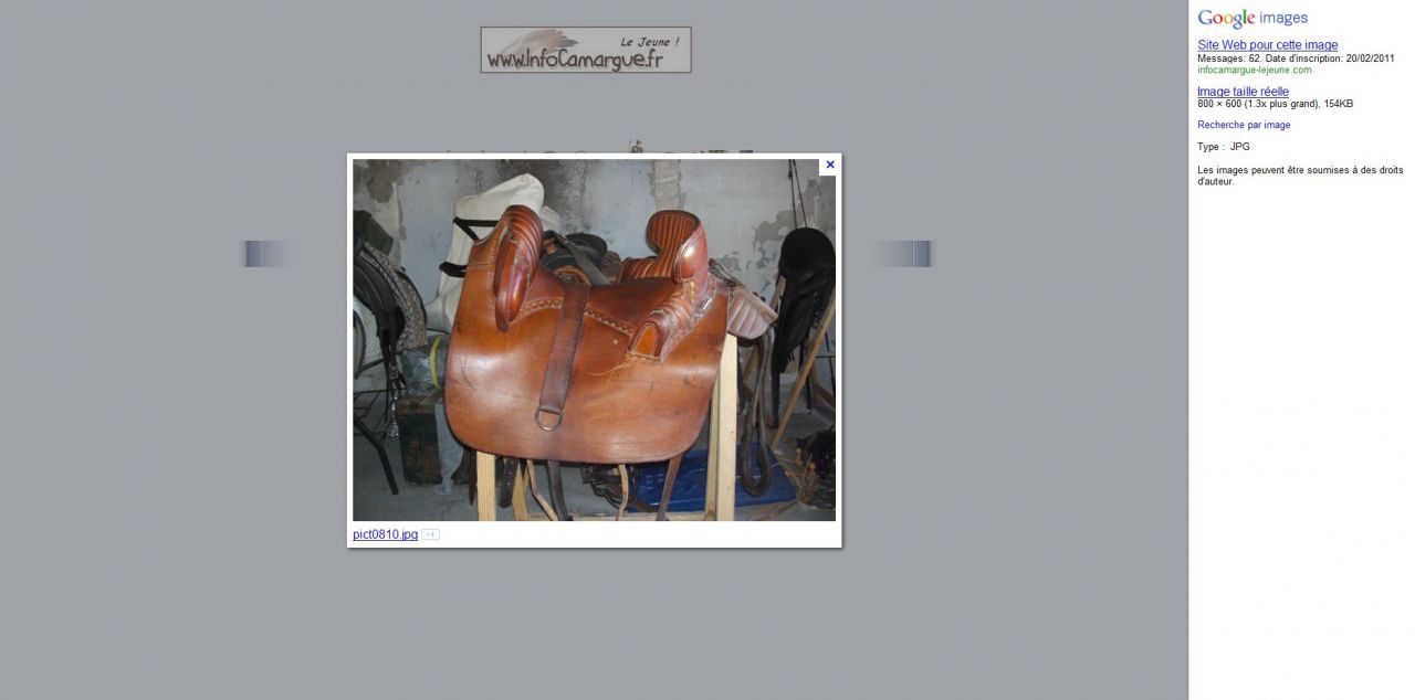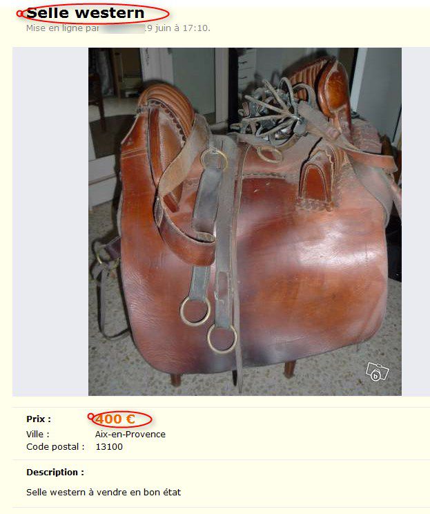 | Dire merci | Attention pour la selle camargue, beaucoup s'en sont fait volés durant ces derniers mois, il se peut que l'une d'entre elle en fassent parties. J'ai la mienne à vendre et je peut vous dire qu'elle est loin d'être à ce prix, d'ailleurs à 400 euros il y a une vrai anguille sous roche donc attention ! ![]() |
