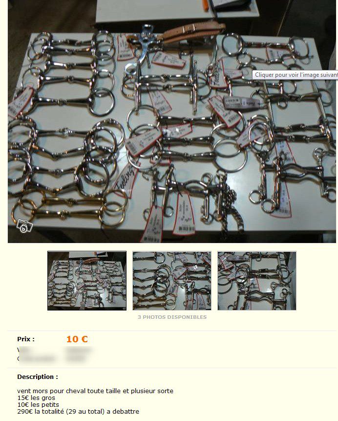 | en tout cas, il se foule pas pour son prix en lot... par contre, y a un hackamore, 15euros, ca fait pas cher non ? |