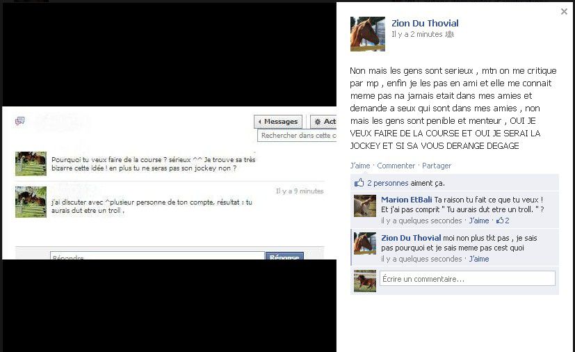 | Dire merci | Ahkal question con mais : a tu Facebook ? si tu n'a pas c'est normal que sa marche pas je ne sis pas trop quoi te dire sinon car juxstine a réussi a y aller ! je remet quand même sans le "lien " juste l'adresse https://www.facebook.com/media/set/?set=a.110668322414061.19901.100004126809811&type=3 et sinon juxtine : mais elle compte débourer son cheval, puis lui faire des course pendant 3 ans (mais ouiiiiiii ) arès du western et tout J'ai beuger quand j'ai vue sa , j'espère "troll " car pauvre cheval quoi ... enfin, c'est mon point de vue "proprio : il veux tres cher , plus de 10 000e meme bcp plus , mais comme je connais votre fille es qu'il es normalement a 1500e sur le site je vous le met a 1400e " Message édité le 28/09/12 à 18:17 |