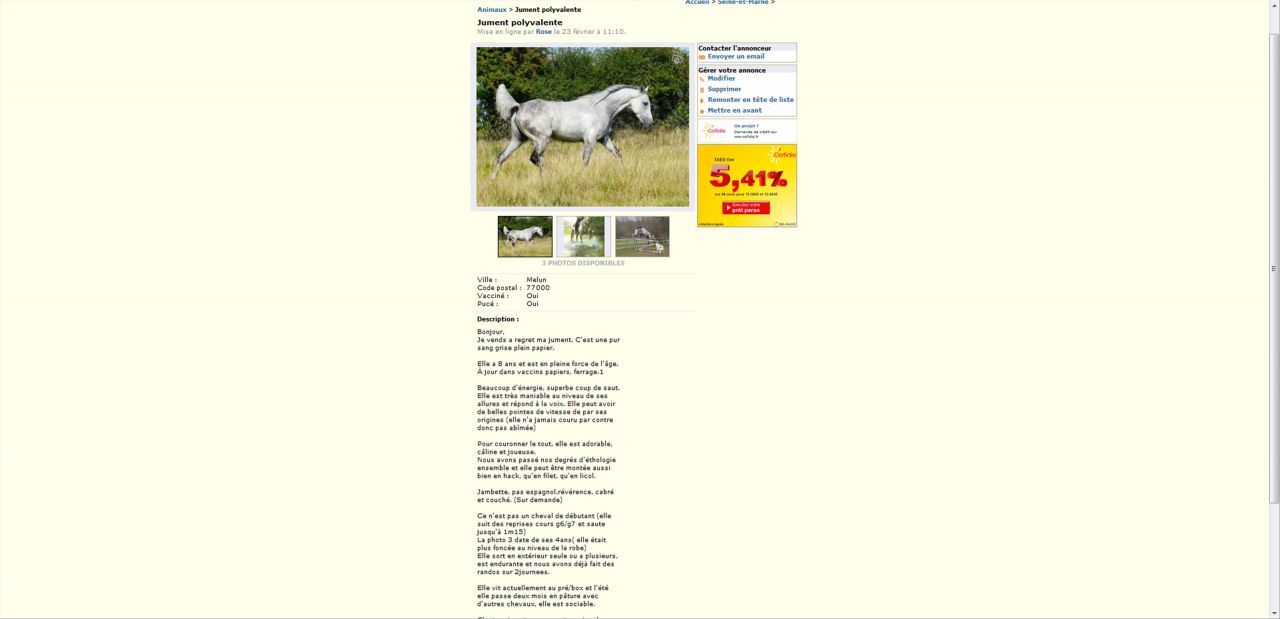 | Dire merci | Je n'ai eu aucune nouvelle en signalant que c'était ma jument et non la sienne Il jure mordicus quelle est a elle. Leboncoin ne réagit pas non plus. |