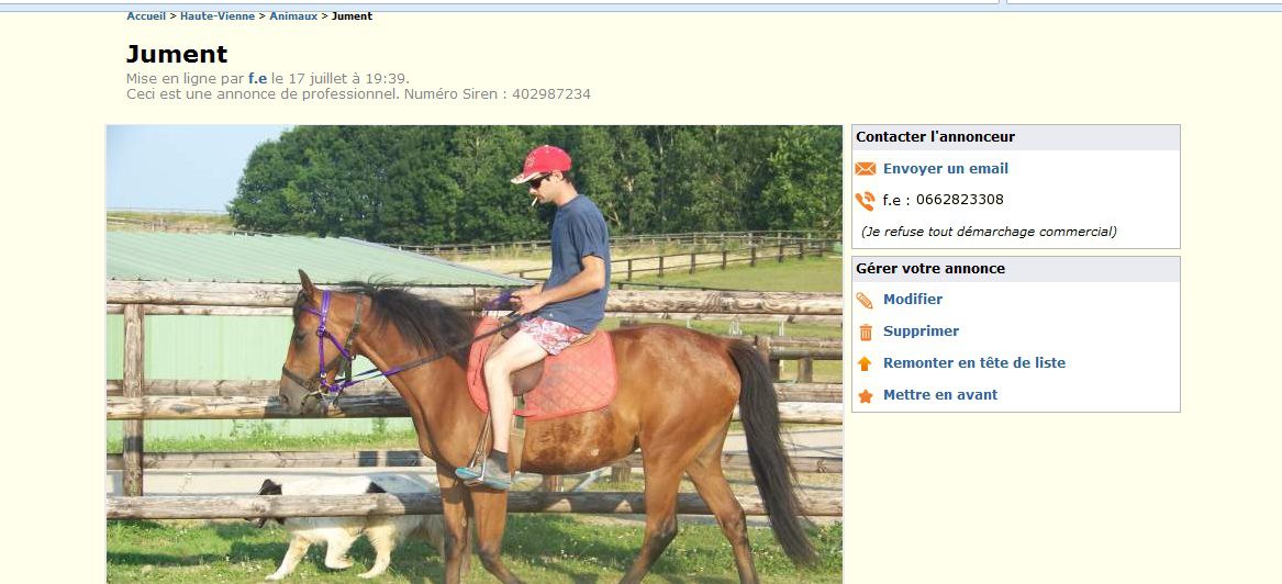 | Dire merci | "ceci est une annonce de professionnel" Bon, moi, la tenue à cheval, je m'en moque, même si je reconnais que ça fait pas vraiment pro... Mais alors le débourrage à 2 ans et surtout la clope en selle . ça, c'est vraiment un truc que je supporte pas!!! D'autant qu'il est vraiment très nul ce gars, il choisit cette photo pour se "représenter" sur un site de vente...![]() Lien |