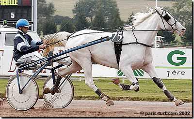 | Dire merci | le trotteur blanc est une jument et s'appelle Margot Severoise et j'ai trouvé une photo, elle est née d'un père bai et d'une mère alezane et elle a bien courut ![]() ![]() |