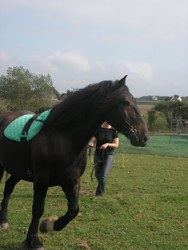 | Dire merci | Oui oui, enfin c'est un cheval d'attelage, donc il connait... Bon à main droite il est pas à l'aise, mais je le savais. |