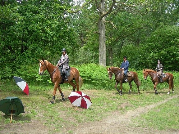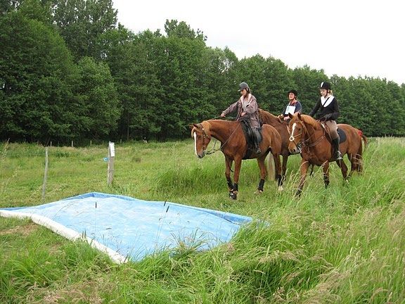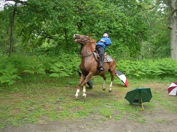 | Dire merci | Une de nos copines a bien failli être par terre, elle s'est rattrapée de justesse car sa jument est partie en sauts de mouton après la bâche :![]() Et un Mr qui n'était pas de notre équipe a fait la même chose que moi mais avec les parapluies ![]() ![]() |