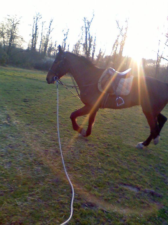 | Dire merci | Harod, pourquoi ne pas carrément couper en brosse?: ça lui donnera l'air plus sportif et mettra en valeur son encolure.![]() Les dernières nouvelles d'Union: samedi ptit retour au saut sur des obstacles fabrication maison. ![]() Y'a un peu de boulot en perpective, Mam'zelle a oblié les leçons de cet été sur "on arrive "calmement". Néanmoins, entre les premiers passages sur mon premier obstacle (à 35/40cm) sur lequel elle a voulu arriver comme une furie, et le dernier passge sur le "gros" (55cm), ça allait déjà mieux. ![]() Un petit aperçu (bien nommé, vu qu'on ne voit pas grand chose mais c'est difficile de cadrer avec un appareil accroché à une branche d'arbre parce qu'on n'a pas d'âme dévouée ) du "gros" obstacle (avec elle, j'ai vraiment l'impression d'attaquer un énorme tronc ) Ca n'est pas le meilleur passage, mais la batterie a flanché quelques secondes avant qu'on passe le meilleur saut (et par conséquent le dernier: je l'ai laissée sur ça, riant tout haut de joie )(grmmff, si la vidéo fonctionne, ça a l'air mal parti je ne comprends pas ce que je fais de travers ![]() [obj]http://www.youtube.com/v/A98zAEJKceU&hl=fr&fs=1[/obj] Dimanche, une bonne balade de 14km; j'ai réussi à faite galoper Union à droite sur une bonne centaine de mètre, mais au prix d'une certaine vitesse (plus précisément, elle a eu besoin d'accélérer un peu pour maintenir le galop à droite quand elle a changé de pied -à la faveur d'une courbe- et je l'ai laissée se faire un bout vite. Résultat, elle a été un peu pénible sur les galops suivants, à vouloir y aller à fond. ![]() Hier une nouvelle tentative aux longues rênes. C'est encore assez folklo de nous voir faire. Pas toujours évident de la faire marcher droit quand elle veut tourner, et de maintenir la marche en avant quand c'est moi qui lui demande de tourner. mais j'ai réussi à la guider sur le talus: y monter, le longer, le descendre. On progresse.J'essaierai sans doute en mors (mais pas le goyo) la prochaine fois, je gagnerai peut-être en précision latérale. Aujourd'hui babalde avec Nic l'Irish et Céline, sa cavalière, le long de la rivière. Union a été extra. Bon, quelques tentatives d'accélération sur les galops du retour, mais rien à voir avec la lutte de dimanche. On a fait un peu passer Nic en tête au retour (il semble ne pas forcément convoiter la place ) Sa cavalière n'a pas réussi encore à le faire galoper en tête, seulement trotter, pendant que, derrière, Union était... au tout petit galop. Bon, si le coco ralentissait trop son trot, elle n'arrivait pas à rester à ce galop plus de quelques foulées (je repassais alors au pas, avant re-galop), mais j'ai trouvé ça vachement bien. c'était variemnt un touuuuuuuuuuuuuuuuut petit galop léger, un vrai régal. |