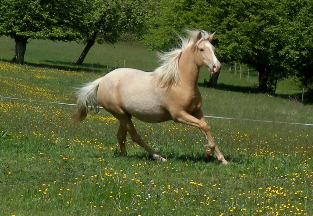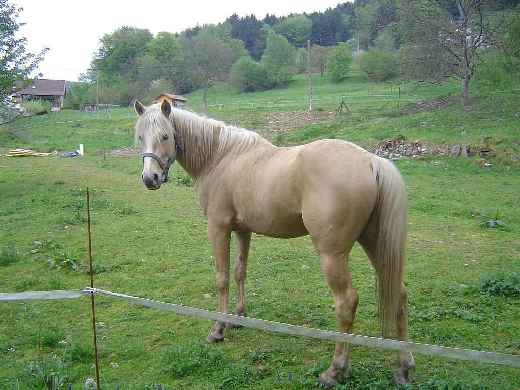 | Dire merci | Santos, entier quarter horse buckskin d'1 an à l'époque appartenant à un dame allemande qui l'avait mis en vacances chez une dame chez qui je montais.![]() |
