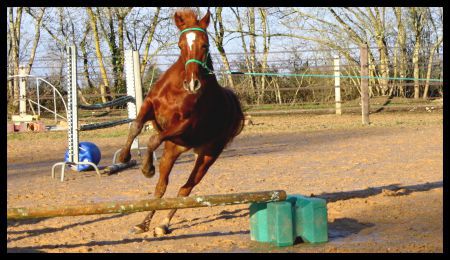 | Dire merci | bon alors petite question a tous avez vous deja fait sauter les votres? combien en hauteur et comment? moi aujourd hui deuxieme sceance en libre de saut de 40cm facon boing 747 en approche sans frein d une petite piste lol plus il saute plus il accelere le but est donc de reussir a sauter au trot le tout sans longe sans chambiere et sans l approcher puisqu il faut le ralentir et bin on a reussi yes par contre au dela il panique severe donc on en reste a cette hauteur petit truc bizzard son jeu des le depart a ete de foncer sur l ennemi faire volte face et degommer un par un les objets a coup de posterieur et ensuite de les finir facon sumo ![]() |
