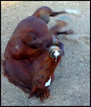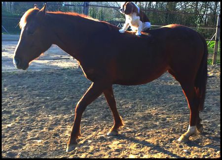 | Dire merci | ouah nimue il a poussé ton gros loulou ! il toise combien la ??? . Chez moi Urmanie va bien hier j'ai voulu bosser la reverence, mais en tatonnant j'ai obtenu............ 2 couchers sur demande lol ! Sacré clown que celle la ! une petite photo de mardi, elle fait naine et grosse a coté d'Electre mais je crois que je devais etre mal placée lol car elle le rattrappe !!! ![]() |