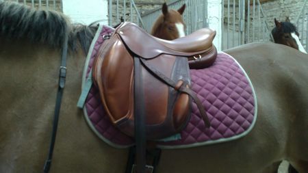 J'ai une selle de dressage de chez baude dans laquelle je suis très bien, et j'ai ma selle trec forestier où je suis encore mieux.